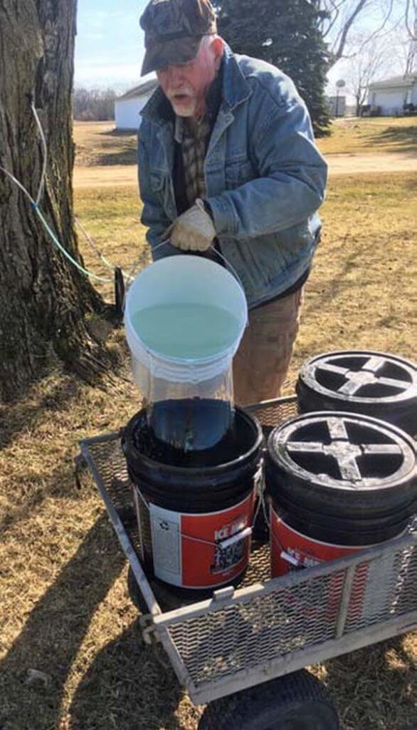 Several taps are placed in his 60-year-old Soft, Silver Maple Trees each year around the 3rd week of February, depending on the weather. “The sap will run once the trees start to thaw, best condition is a cold night, followed by a day warming up to about 40 degrees,” he explained. Once the sap is collected it is transferred to storage containers and kept at a temperature of 38 degrees or colder. It is then boiled with- in 7 days of collection. It takes 40 parts of maple sap to make one quart of syrup. The sap is boiled to remove excess water over intense heat, until it reaches 219 degrees. Riegle collects approximately 200-250 gallons of sap each season from his trees and turns that sap into approximately 5 gallons of delicious maple syrup. The entire process takes about 4-6 weeks each year.