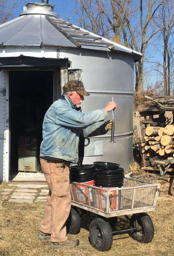 Riegle, who describes himself as a micro- hobbyist, got started tapping his own trees and making Maple Syrup after he purchased a grain silo in Eaton Rapids from an online auction. Tim and his brother Dave transported the silo to Elsie and set it up. He turned an ordinary filing cabinet into a wood stove, placed it inside the silo creating his very own “Sugar Shack”.